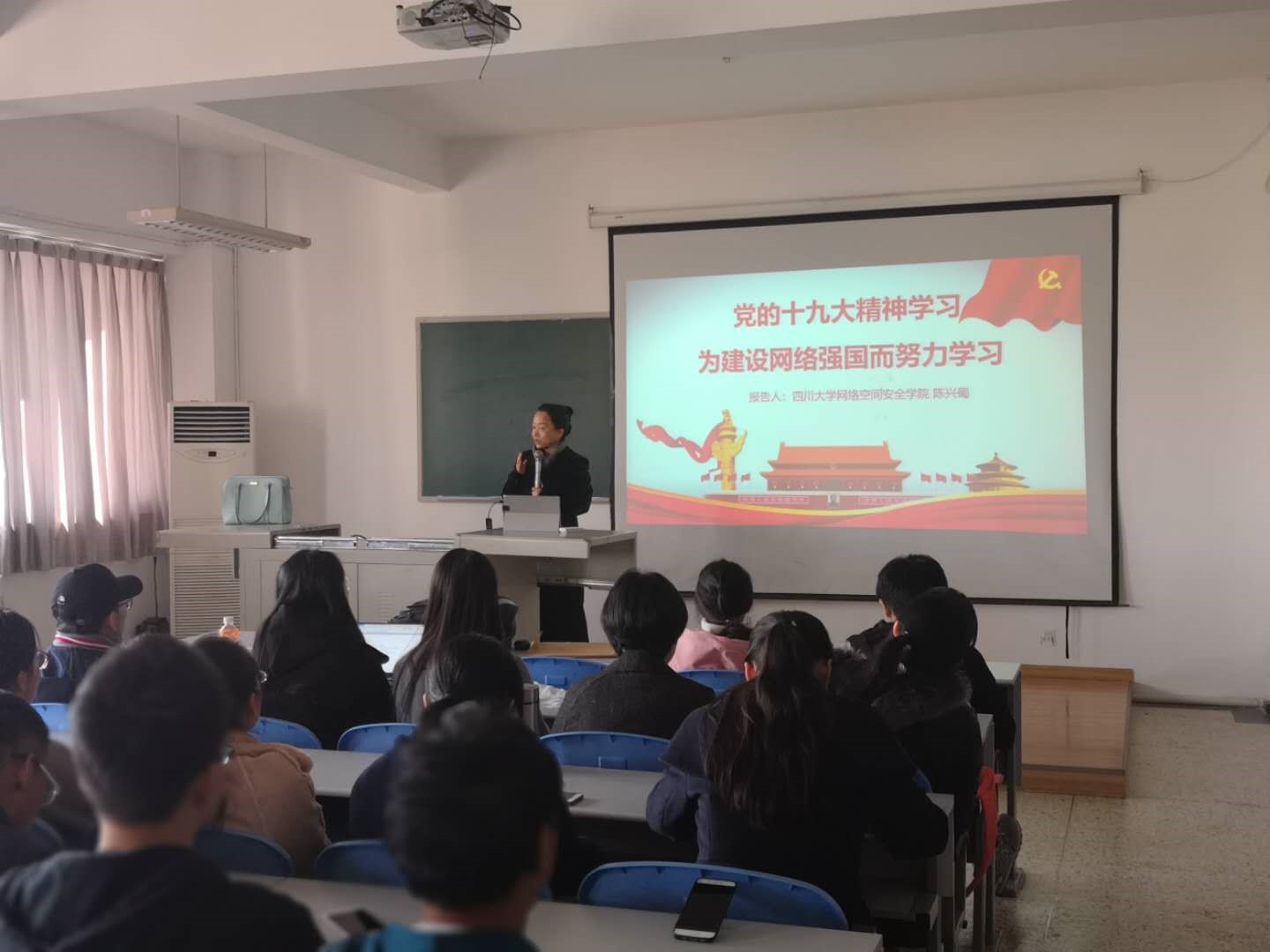 12月8日下午3:00,英国上市官网365常务副经理陈兴蜀教授在江安校区第二基础实验楼B404给全体英国上市官网365本科生作了主题为“十九大精神学习与网络强国战略”的报告。参与人员有英国上市官网365辅导员黎红友老师以及全体英国上市官网365员工。