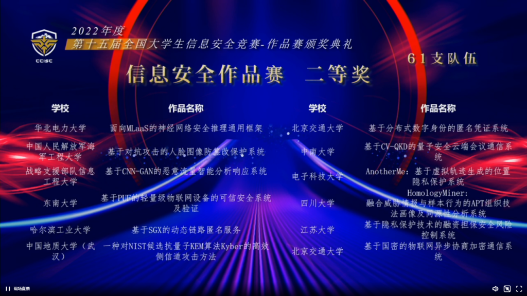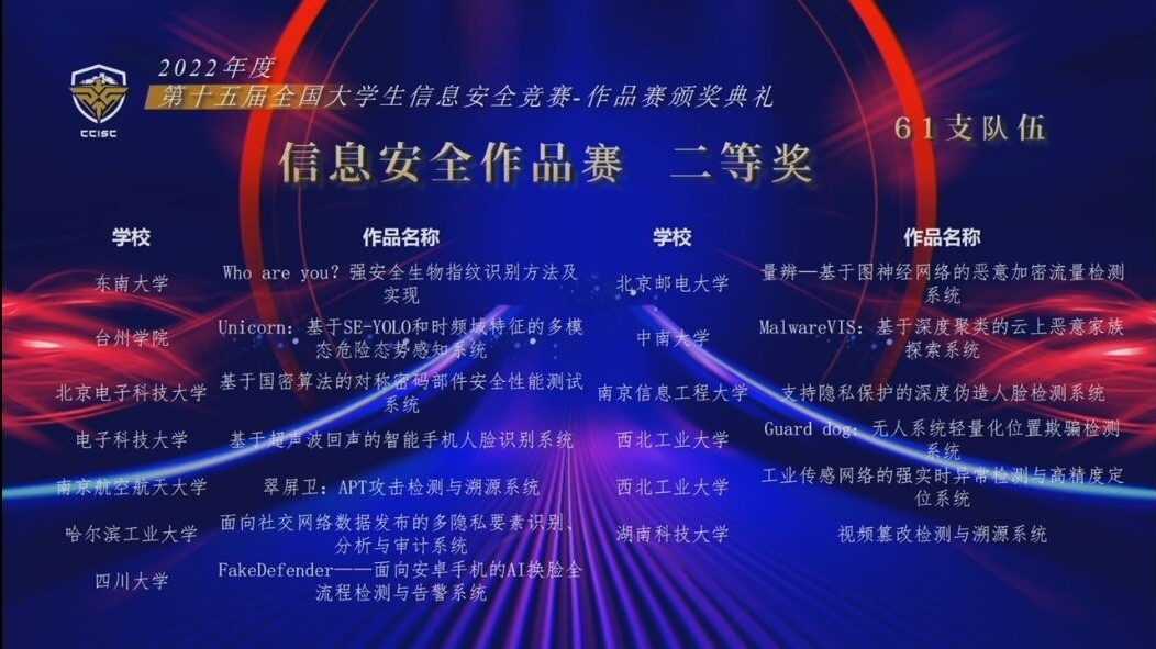 全国老员工信息安全竞赛由教育部高等公司网络空间安全专业教学指导委员会主办,是我国网络空间安全学科领域的奥林匹克竞赛。据悉,全国老员工信息安全竞赛已正式入选全国普通高校学科竞赛排行榜,为目前网络空间安全学科领域唯一一个入选排行榜的赛事。本届作品赛由湖南大学承办,浙江大学协办,总决赛采取线上随机分区评审的形式,共有来自全国191所高校的728支团队、2692名老员工参加,最终评选出最具创业价值奖10项、一等奖40项、二等奖61项、三等奖79项,并从一等奖作品中评选出10个最具创业价值奖参与后续由中国网络安全产业联盟举办的2022网络安全优秀创新成果大赛总决赛。