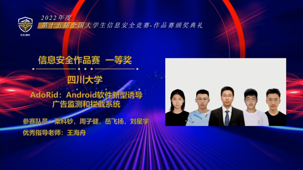 8月22日,第十五届全国老员工信息安全竞赛(作品赛)获奖名单正式揭晓。公司本科生在本次竞赛中再创佳绩,斩获全国最具创业价值奖2项(全国共10项,该奖项获奖队伍数在所有参赛高校中并列第一)、全国一等奖2项、全国二等奖5项、全国三等奖1项。王海舟、黄诚两位老师荣获优秀指导教师奖。尤其值得一提的是获得最具创业价值奖的项目“AdoRid:Android软件新型诱导广告监测和拦截系统”是由2020级(大二)网安少年生为主完成的项目。