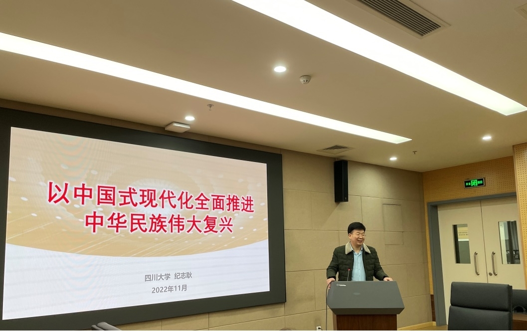 纪志耿教授以“以中国式现代化全面推进中华民族伟大复兴”为题,以党的二十大报告为切入,围绕中国式现代化的历史逻辑、理论逻辑、实践逻辑、基本特征、本质要求和推进中国式现代化的重大原则六个方面,对中国式现代化道路的特征和意义,作了全面深入的解读。纪志耿教授梳理并介绍了中国式现代化发展的六大阶段历史逻辑,重点阐述了中国式现代化的五大特征和推进中国式现代化的五大原则,着重分析了坚持发扬斗争精神,指出在风险挑战面前,敢于斗争才能赢得胜利,才能赢得历史主动,才能不断增强我们勇毅前行的志气、骨气、底气。