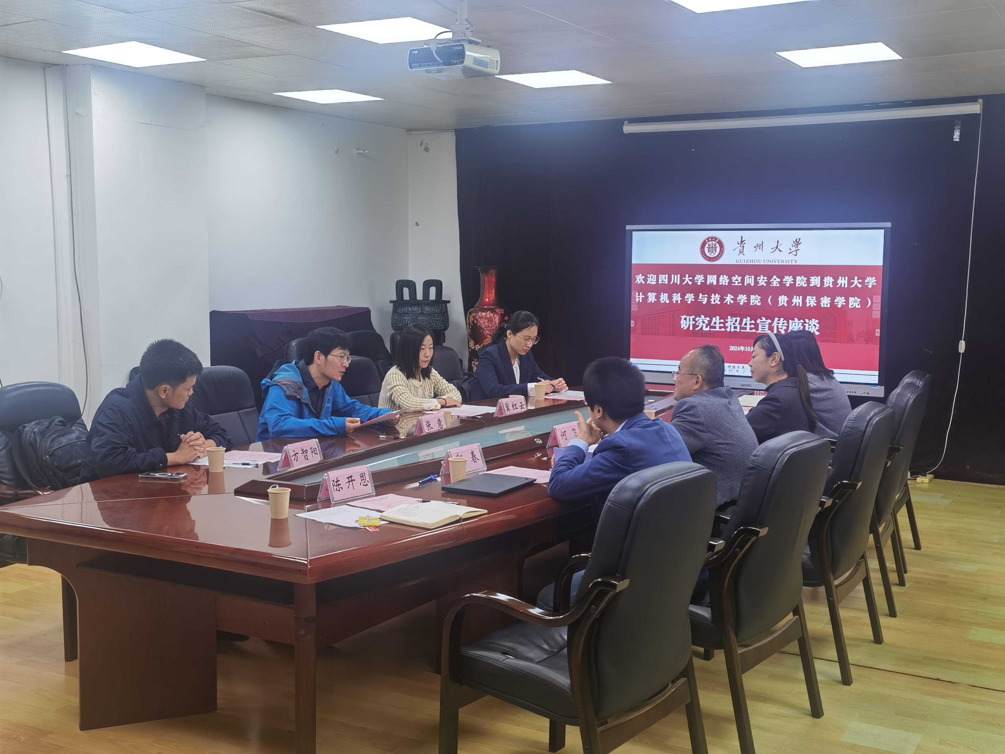 10月17日,公司党总支副书记兼副经理张意一行赴贵州大学计算机科学与技术公司(贵州保密公司)开展研究生招生宣传座谈。座谈由贵州大学计算机科学与技术公司(贵州保密公司)党委副书记何飞主持。计算机科学与技术公司(贵州保密公司)郭春、牛坤、陈开恩、李模弋等4名教师和20余名员工,公司李晓慧、方智阳和冀红云等3名教师参加座谈。
