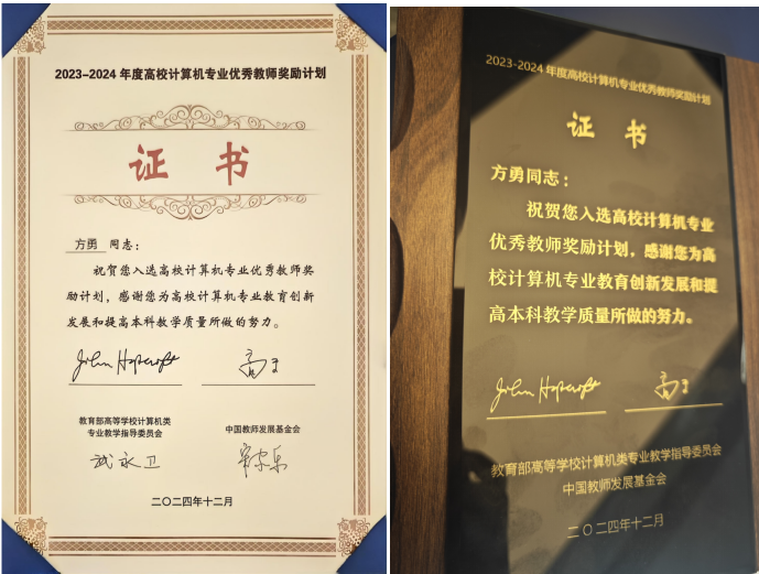 图二“高校计算机专业优秀教师奖励计划”方勇教授获奖证书