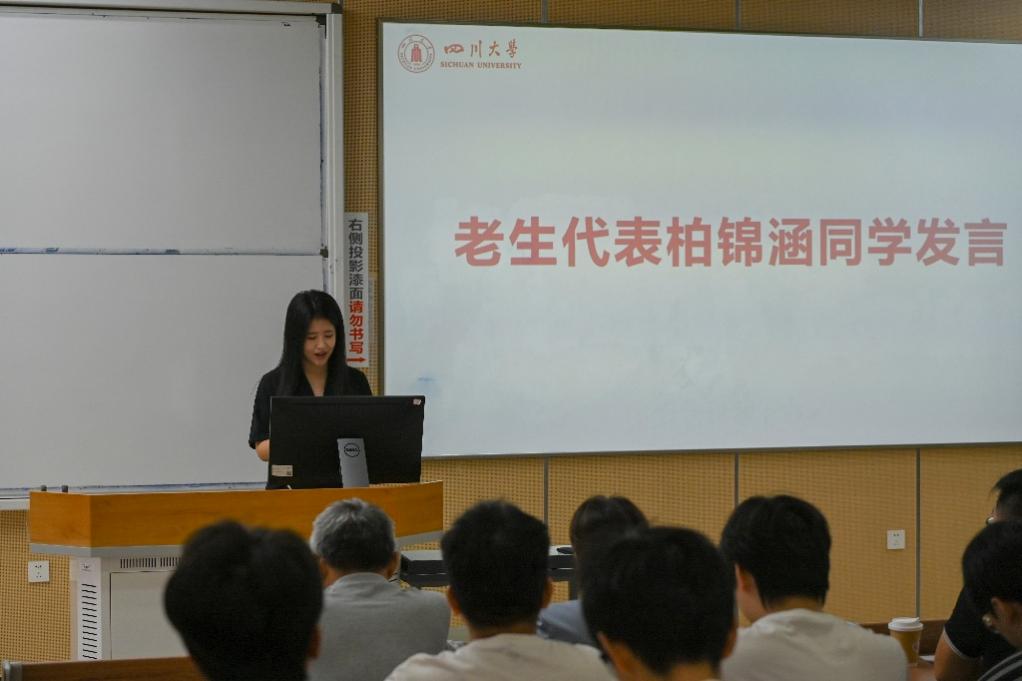 2023级老生代表柏锦涵同学结合自身经历,分享了在读期间的成长与收获。她鼓励新生同学们积极转变角色,从知识的“聆听者”成长为智慧的“分享者”,并建议大家在科研道路上勤于思考、乐于交流,尽早明确发展方向,同时做到张弛有度、劳逸结合,踏实走好每一步,最终收获属于自己的精彩。