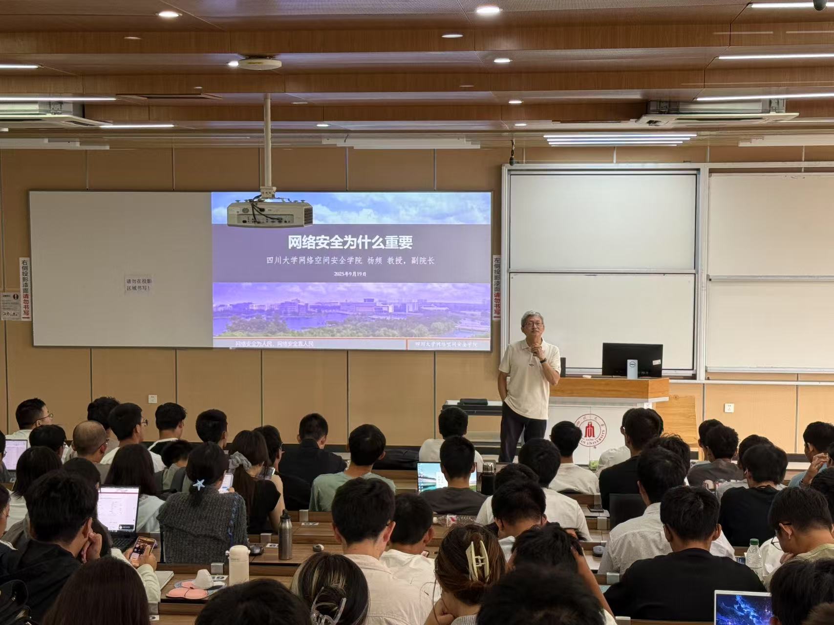 随后,教学副经理杨频教授以“为什么网络安全很重要”为题作总结讲座。他强调了提升防护技能与安全意识的重要性,科普了日常生活中的常见网络威胁,并指出,作为未来网安人才,同学们应立志以技术维护国家利益、保卫国家安全,切实担当起时代赋予的使命。