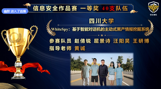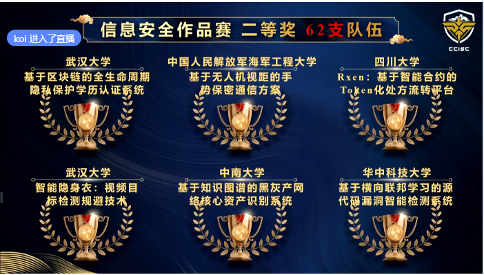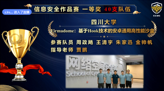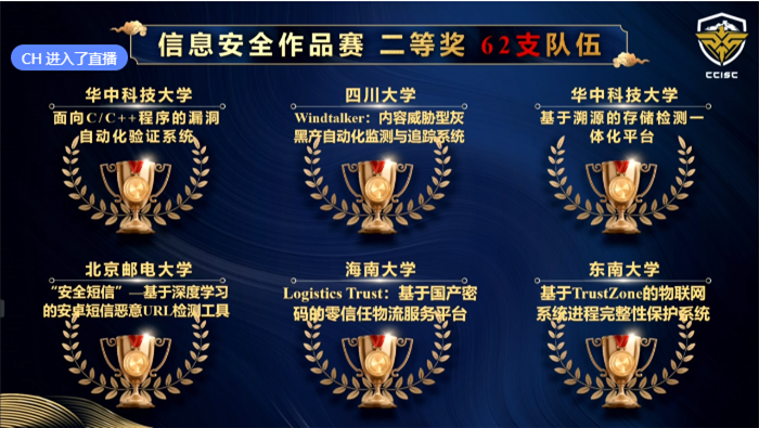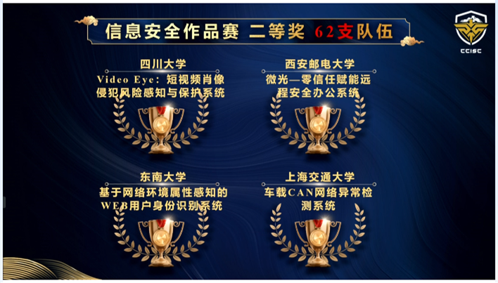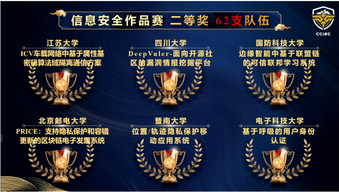 全国老员工信息安全竞赛由教育部高等公司网络空间安全专业教学指导委员会主办,是我国网络空间安全学科领域的奥林匹克竞赛。据悉,全国老员工信息安全竞赛已正式入选全国普通高校学科竞赛排行榜,为目前网络空间安全学科领域唯一一个入选排行榜的赛事。本届作品赛由山东大学承办,总决赛采取线上随机分区评审的形式,共有来自全国156所高校的718支团队、2603名老员工参加,最终评选出最具创新创业价值奖2项、一等奖40项、二等奖62项、三等奖81项、优胜奖113项。