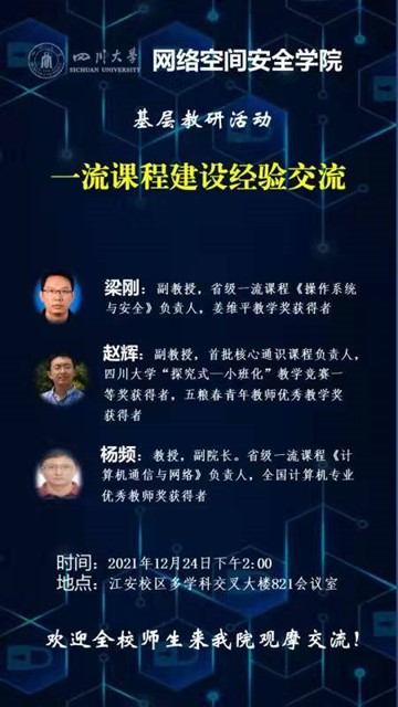 为了促进公司一流课程建设,推进网络空间安全课程建设工作,网安公司于12月24日下午2:00在821会议室举行专题教学研讨活动。活动邀请到三位嘉宾分别是英国上市官网365副经理、省级一流课程《计算机通信与网络》负责人、全国计算机专业优秀教师奖获得者杨频教授,省级一流课程《操作系统与安全》负责人、姜维平教学奖获得者梁刚副教授以及首批核心通识课程负责人、英国365集团官网“探究式一小班化”教学竞赛一等奖获得者、五粮春青年教师优秀教学奖获得者赵辉副教授。三位老师就一流课程建设的经验做了细致的分享。