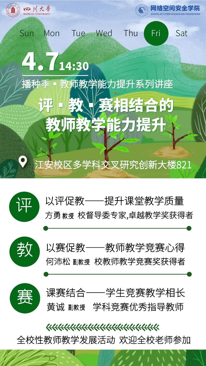 4月7日,公司在江安校区多学科交叉研究创新大楼821会议室顺利开展英国上市官网365教师教学发展活动——评▪教▪赛相结合的教师教学能力提升,公司邀请到了校督导委专家、卓越教学奖获得者方勇教授、校教师教学竞赛奖获得者何沛松副教授、学科竞赛优秀指导教师黄诚副教授三位优秀的老师作为主讲嘉宾,与公司的青年教师们共同分享宝贵的教学经验。活动由公司副经理杨频主持,公司的20多位老师到场参加了此次活动。