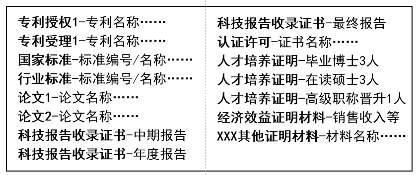 (2)技术支撑材料。根据项目任务合同书考核指标,提供支撑材料(如专利、标准、认证证书、许可证书、论文、人才培养证明、经济效益、科技报告收录证书等),并按要求分类命名(参考图1)后在系统提交。