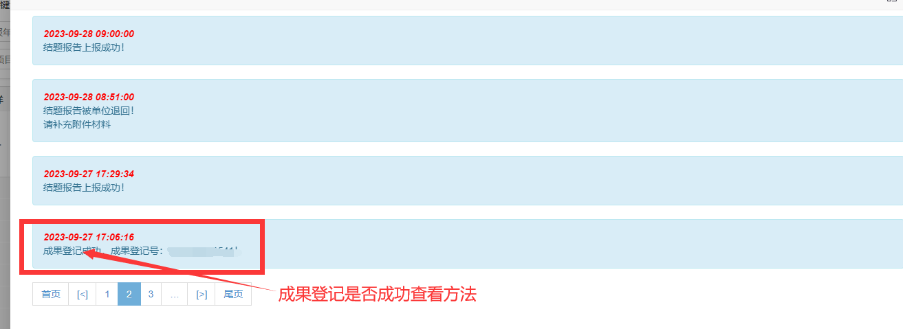 请项目负责人接到绩效评价结论后,按以下步骤完成成果登记,成果登记成功后,将系统截图(查看成果登记状态及截图示例见图2)交至公司科研秘书处备案。成果登记不成功的项目,不予进行验收通过。