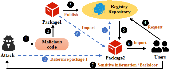 根据恶意行为特征,论文设计了自动化的分类模型,初步将恶意代码分为五类。研究发现,超过 50% 的恶意代码表现出多种恶意行为,其中信息窃取和命令执行尤其普遍。此外,还发现了几种新颖的攻击向量和反检测技术。安装时攻击是将恶意代码嵌入在setup.py文件中,当恶意包被安装时会触发其中的恶意代码。运行时攻击的恶意代码嵌入在“other.py”中,当受害者调用具体的方法时才会触发。