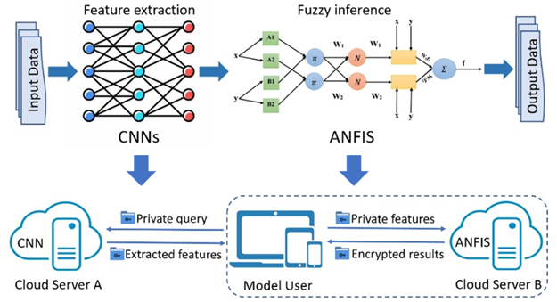 深度神经网络(DNNs)在图像识别、自然语言处理、医学诊断等领域成果显著,但因其数十亿连接权重的复杂性,理解和信任成为难题,可解释人工智能模型应运而生。深度神经模糊推理系统(DNFIS)融合深度学习的模式识别与模糊逻辑的可解释性,能实现精确透明决策,在医疗、法律等领域优势突出,还借助规则表示和直观语言变量确保清晰性,展现出高性能。然而从数据安全角度看,当用户向第三方模型所有者发送推理请求时,数据传输存在被窃取或篡改风险,如医疗诊断场景中,用户上传的敏感健康数据在传输和存储时,若防护措施不到位,就可能因黑客攻击、内部人员违规操作等导致数据泄露,严重威胁个人隐私和数据安全。强化DNFIS这类模型推理服务的数据安全防护,在数据传输加密、密文域推理等方面采取有效措施,具有现实需求。因此,本文提出了名为PrivDNFIS的方案。