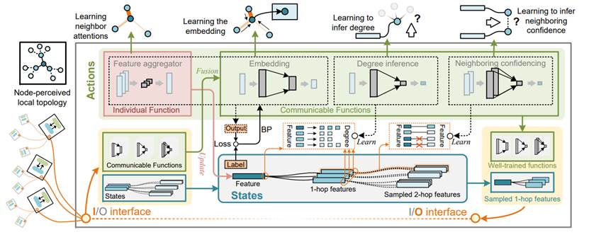 针对这一挑战,本研究提出了图智能体网络(GAgN),这是首个通过去中心化智能体机制来增强节点自主推理能力的图神经网络防御模型。与传统防御模型依赖全局优化的方式不同,GAgN赋予每个节点独立的1跳邻居视野,通过去中心化的智能体间交互,节点能够逐步获得整个网络的全局信息,从而有效识别并过滤对抗性边。GAgN的设计理念源自自然界中的去中心化智能,防止恶意信息的全局传播,抵御基于全局优化的二次攻击。GAgN不仅能够有效提升节点分类精度,且具有较强的对抗性边过滤能力,实验结果表明,与目前最先进的防御方法相比,GAgN在面对扰动数据集时的分类准确率表现最佳。此外,GAgN的计算复杂度得到了显著降低,通过理论证明,GAgN仅需要单层的感知机(MLP)即可实现任务的完成,从而极大地提高了模型的效率。实验结果也显示,GAgN能够有效防止自适应攻击,即使在全局训练接口被关闭的情况下,依然能够保持对抗性鲁棒性,确保安全性和性能的平衡。