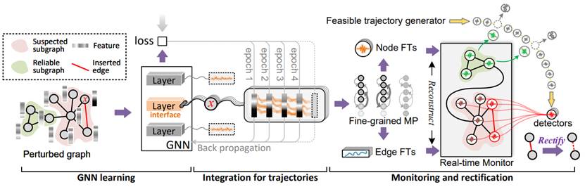 针对这一问题,本研究提出了图神经网络免疫系统(GRIMM),这是首个“即插即用”的防御方法,能够在不改变原有GNN架构的基础上,有效防止中毒攻击。与传统的防御机制不同,GRIMM通过监控GNN训练过程中的特征轨迹,实时检测和修复图中出现的对抗性边,确保GNN能够在正常训练的同时,抵御恶意攻击。该模型的创新之处在于,它将生物免疫系统的工作原理应用于图神经网络,利用特征轨迹的异常变化来识别并修正攻击,同时保障防御过程的独立性和并行性,不会干扰GNN的训练和优化。GRIMM不仅能够与主流GNN模型(如GCN、GAT和GraphSAGE)兼容,还具备良好的可转移性,能够在不同系统之间共享检测器,大幅提升修复效率。实验结果表明,GRIMM在多个真实数据集上表现优异,显著提高了GNN在恶意攻击下的分类准确性,同时减少了计算开销,尤其在大规模图数据集上展现了可喜的效率。