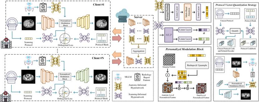 针对这些低剂量CT成像领域的关键问题,英国上市官网365张意教授团队对成像的物理过程进行思考,并提出通过设计双重物理驱动的个性化联邦CT成像框架(《Patient-Level Anatomy Meets Scanning-Level Physics: Personalized Federated Low-Dose CT Denoising Empowered by Large Language Model》)该论文通过实现通过引入对影响低剂量CT的解剖和扫描的相关物理特征实现切片级的个性化成像。具体而言,该方法通过引入医疗大模型,对解剖信息进行提取对成像特征的空间信息进行调制,并且通过设计超参网引入几何参数对成像特征进行正则化调制。实验结果表明,该方法可以在不同低剂量策略上均取得较好的重建效果,并且可以与不同的成像网络进行结合,具有较好的泛化能力。该成果被CVPR 2025录用,该成果联合东南大学、复旦大学合作完成,2021级博士生杨子元为第一作者,张意教授为通信作者。