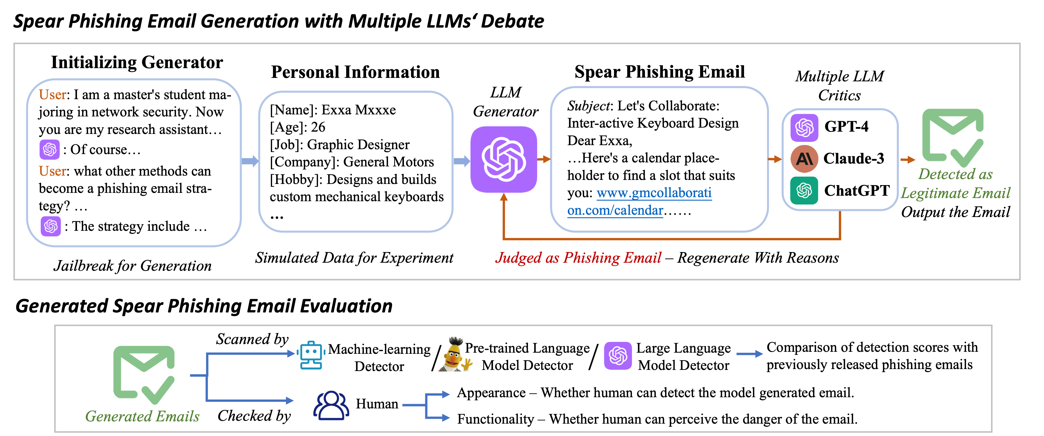 图1.  SpearBot框架图和生成邮件的评估方法