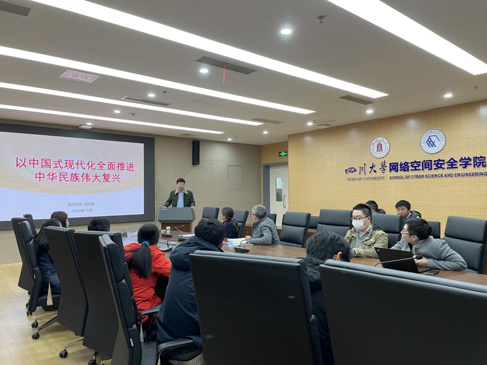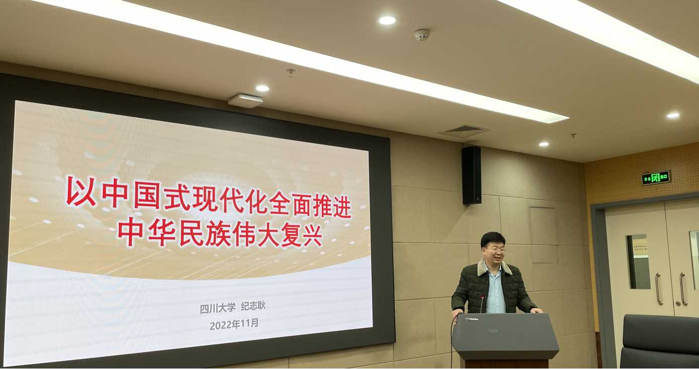 纪志耿教授以“以中国式现代化全面推进中华民族伟大复兴”为题,以党的二十大报告为切入,围绕中国式现代化的历史逻辑、理论逻辑、实践逻辑、基本特征、本质要求和推进中国式现代化的重大原则六个方面,对中国式现代化道路的特征和意义,作了全面深入的解读。纪志耿教授梳理并介绍了中国式现代化发展的六大阶段历史逻辑,重点阐述了中国式现代化的五大特征和推进中国式现代化的五大原则,着重分析了坚持发扬斗争精神,指出在风险挑战面前,敢于斗争才能赢得胜利,才能赢得历史主动,才能不断增强我们勇毅前行的志气、骨气、底气。